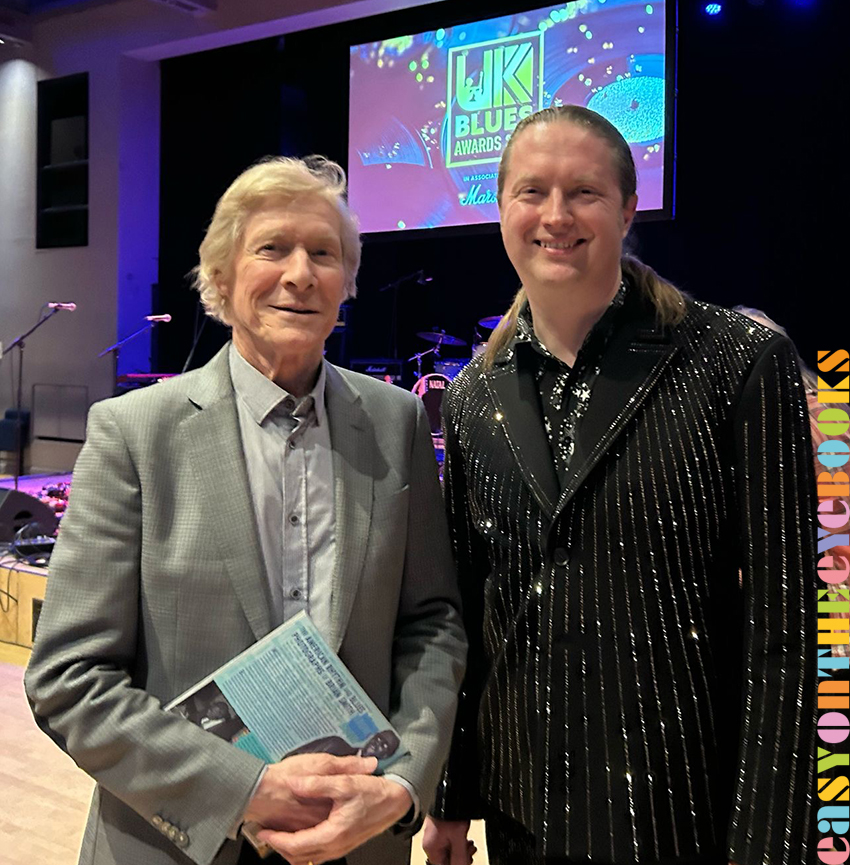 In the meantime here is a nice photograph of two blues musicians who had just taken delivery of a copy of the book. That’s Paul Jones on the right and Oli MacDonald. Paul did the foreword for the book and Mark Stratford was able to present him with a copy at the recent UK Blues Awards evening. Proudly showing off the BACK cover!!