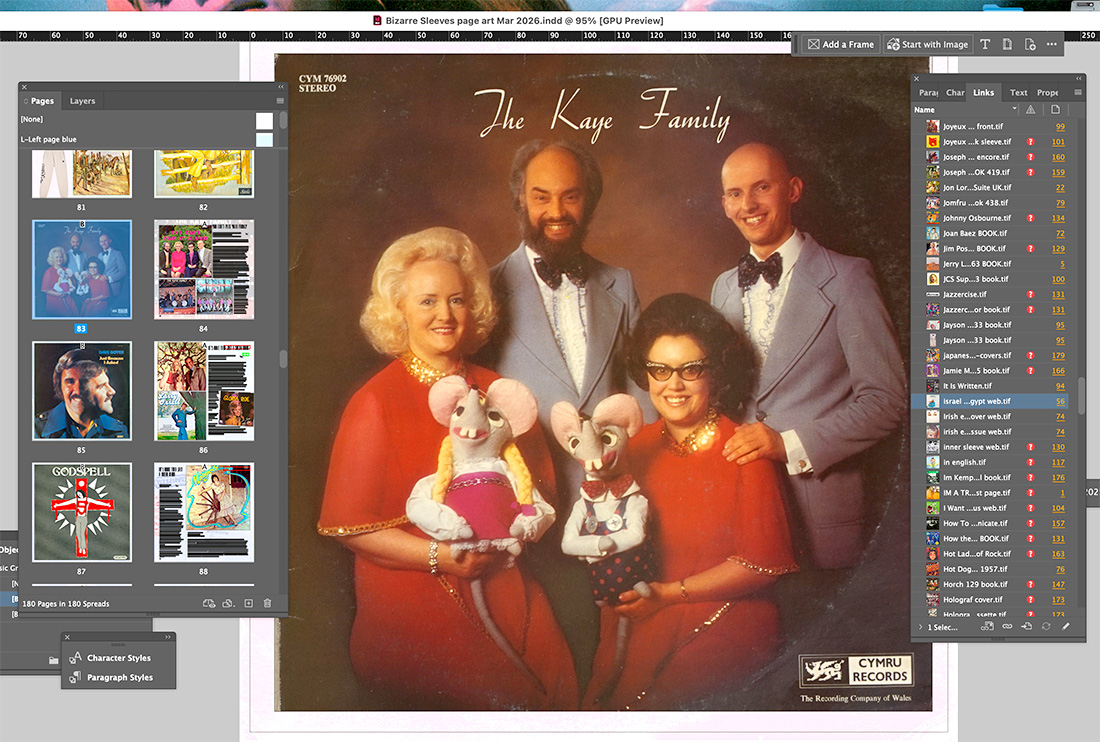 Here we are, hard at work trying to rescue the Art Of Bizarre Vinyl Sleeves book! Working towards a second printing we could have just given the printer the original PDF production files, but there are a few typos which needed tidying up. Plus we want to have a go at an ebook edition too. However opening the original InDesign layout files showed that, following a move to a newer laptop and operating system, ALL the links to the images files had been lost. So it’s been a case of manually finding each one and relinking the whole lot. Still, I’ve just passed page 100 so the end is in sight, though a couple of images have disappeared altogether. How do you lose The Planets? I backed everything up at the time of the first print run so we’ll hook up the hard drives and hopefully the missing scans will be there. And to be honest it’s still great fun to see the covers once again and hard not to start laughing all over again. Here are The Kaye Family for example, playing with their giant felt rodents on page 83. We still have no idea why. More details via the link below.