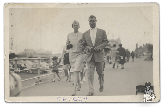 Carole and Brian in Skegness. This is Carole and Brian on holiday in Skegness (or Skeggy to many trippers) in 1961. Carole says they got used to the street photographer, and bought a few of the postcards as a souvenir. She also adds that while they look as if they're on their way somewhere very posh, they were actually off to watch the early evening wrestling match!