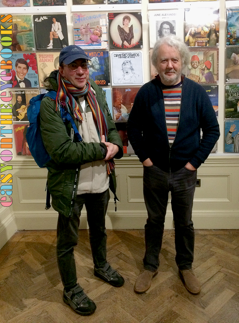 Below; Steve Goldman on the left (with Easy Books’ Simon Robinson) at the Worst Sleeves exhibition at The Williamson Gallery in January 2024 (photo © Ann Warburton).