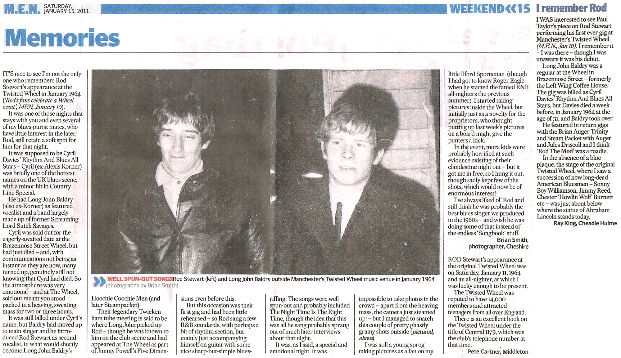 These letters were printed in the Manchester Evening News in response to a mention of Rod Stewart’s concert at The Twisted Wheel, to which Brian Smith responded with a couple of his images they printed.  The shot of Rod is in the new book but I thought it might be interesting to see the cutting which Brian saved.