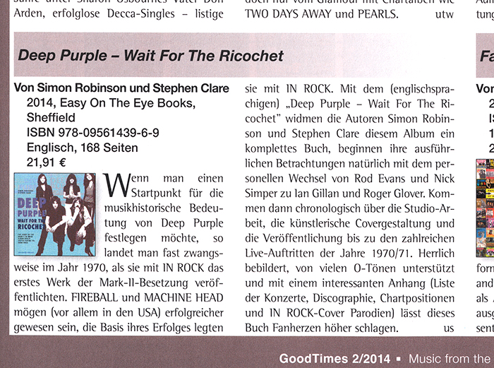 Even if you’re not that interested in the album, the book looks fantastic, chock full of rare photographs and memorabilia. The late Jon Lord was interviewed specifically for the book, Roger Glover has also provided new insights on the writing of the album and Ian Gillan offers a fresh look at Child In Time. There are also contributions from studio personnel, former managers and others. It’s a joy to flick through and savour, even if the resulting album was no “The Book of Taliesyn”! Stuart Hamilton [http://www.the-rocker.co.uk]