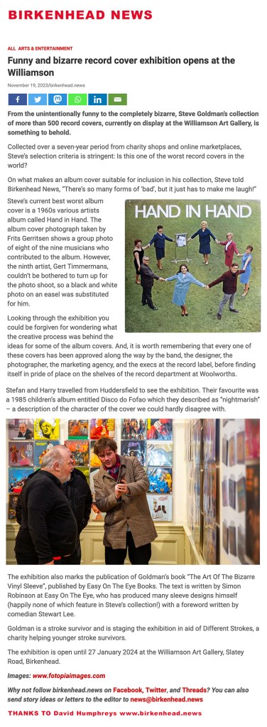 People enjoying the exhibition at the Williamson Gallery in November 2023. You may need to take your own stepladder to see the top row of sleeves! Photo above courtesy Birkenhead News website, their review of the event and mention of the book is below. Thanks also to DiversityPR.