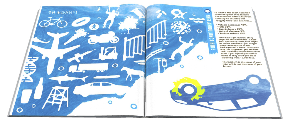 The Very Alternative Guide To Spinal Cord Injury mixes text, advice, graphics, images, photographs and humour to help people come to terms with the issues they will encounter following a major operation. The aim is to provide patients and people recovering from specific injuries with material which can provide help and support through relating what they are likely to come up against and the advice and experience of people who have been through it before. The very visual approach to the book (shown in the spreads below) has already provoked much praise. This book was first launched to dedicated NHS spinal injury units and associated charities but following many requests has now been made available through retail outlets for people to purchase for themselves or friends. The hardback title can be ordered direct from our dedicated online store.