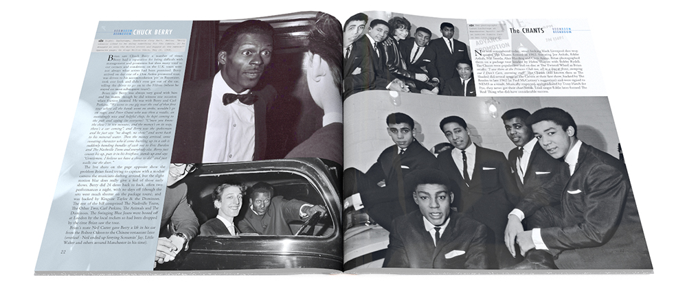 Here’s another spread from the book, Chuck Berry in animated conversation with one of Brian’s friends backstage and later larking about in his mate’s car before they all went out for dinner. The other page shows The Chants, one of whom later founded The Real Thing.