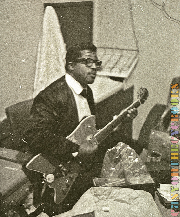 Two photographs of guitarist Bo Diddley. The top photo is backstage at one of the big package tours, but the poor lighting meant Brian had to use long exposures so the photos were a little blurred. However it is interesting to see the basic nature of the backstage set up, Bo literally living out of suitcases. There’s even a drying rack if he fancies doing the washing up! The bottom photo is from a show at The Jigsaw Club in Manchester, the ceiling so low Bo is having to keep his head down!