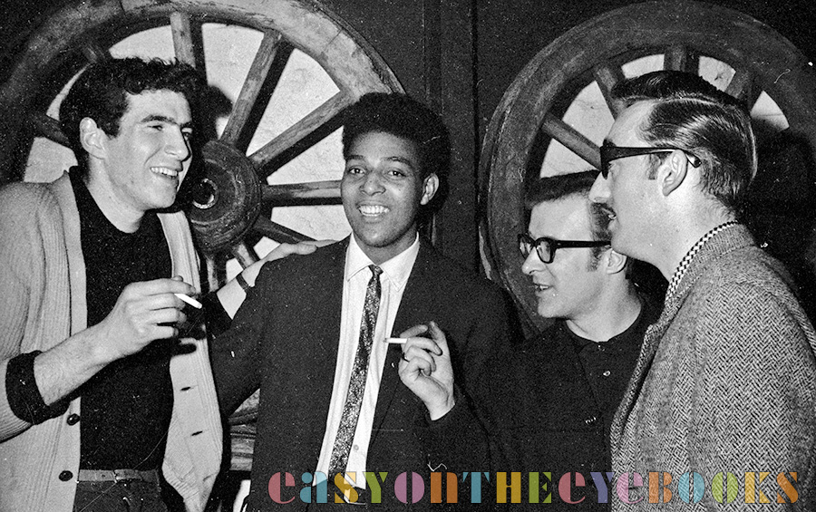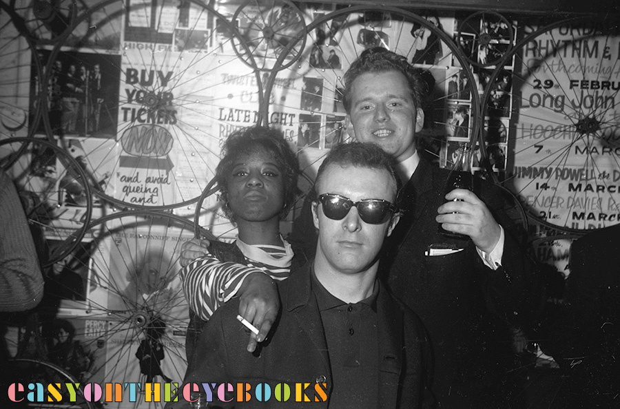 Two great shots inside the Twisted Wheel Club. The top one shows Roger Eagle, who booked many of the r’n’b acts and started the famous one nighters, with some of the club regulars including Dave Waggett on the right. The second photo shows Brian Smith with two of his friends, Roger Fairhurst (and possible Gloria next to him) inside the same club. Notice the fabulous wall decoration, a screen of old bike wheels, with posters, sleeves and some of Brian’s prints.