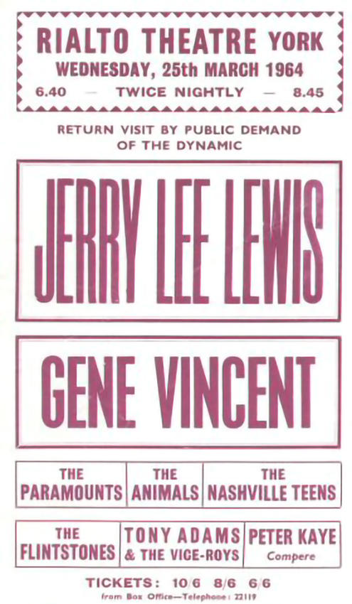 Jerry Lee Lewis was touring with a package tour, supported by Gene Vincent. I have not been able to find a flyer for the exact show but this one for York a couple of days earlier on the same tour through March 1964 gives us the full list of bands. I think Lewis would be backed by The Nashville Teens (who are also featured in Brian’s book).